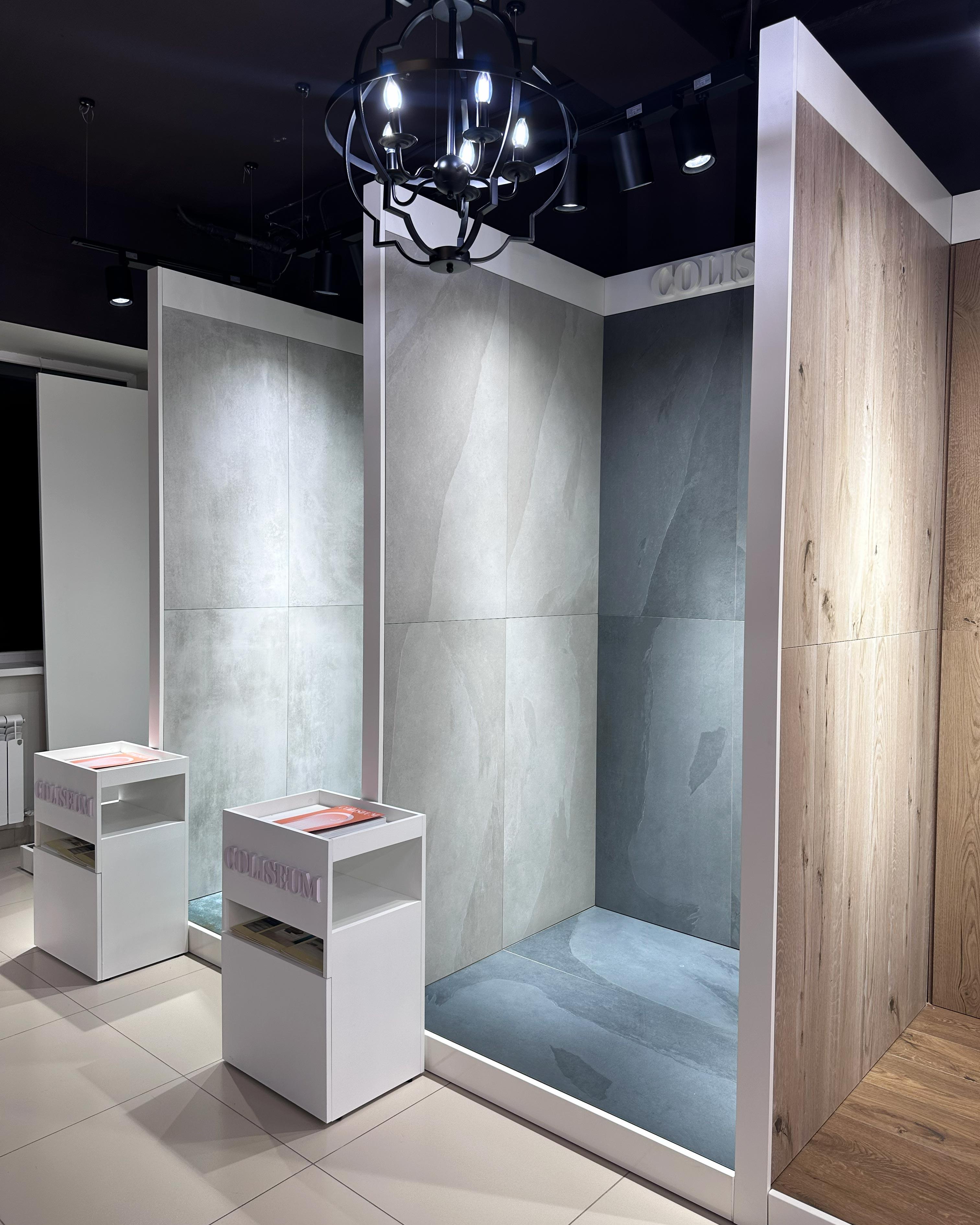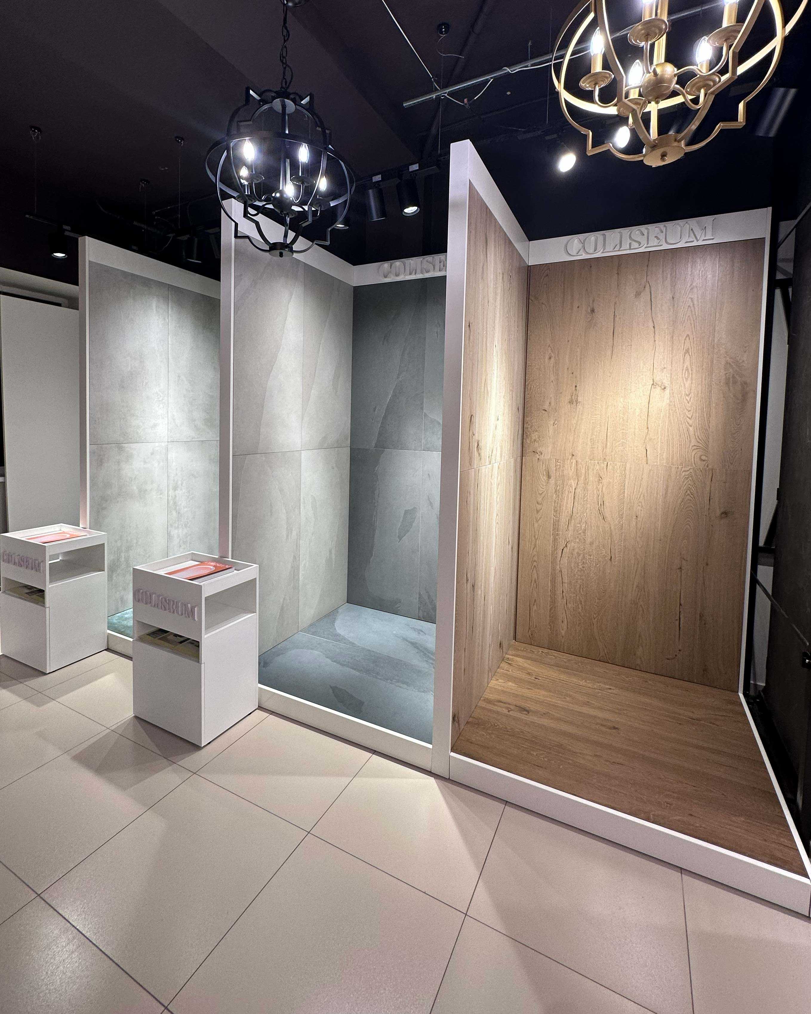 Центральным элементом новой бренд-зоны стал модульный корнер — детально продуманная экспозиция, где каждая коллекция представлена в отдельном боксе во всех её цветах. Это помогает сформировать первичное визуальное впечатление и оценить графические текстуры, оттенки и общий стиль плитки Coliseum.
